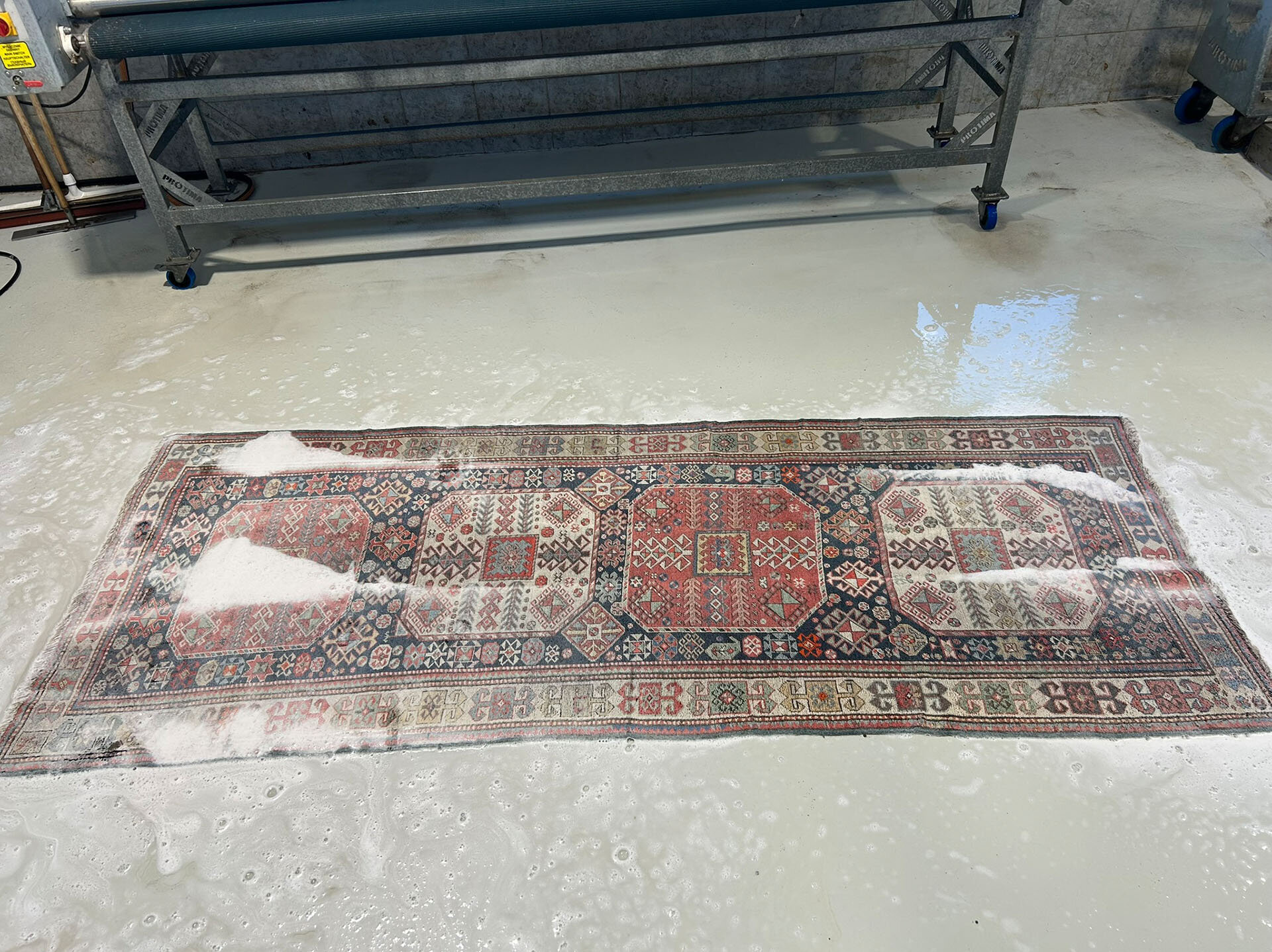 Nachdem der Teppich in unserer Entstaubungsanlage von den groben Verschmutzungen befreit worden ist, beginnt der Waschvorgang.