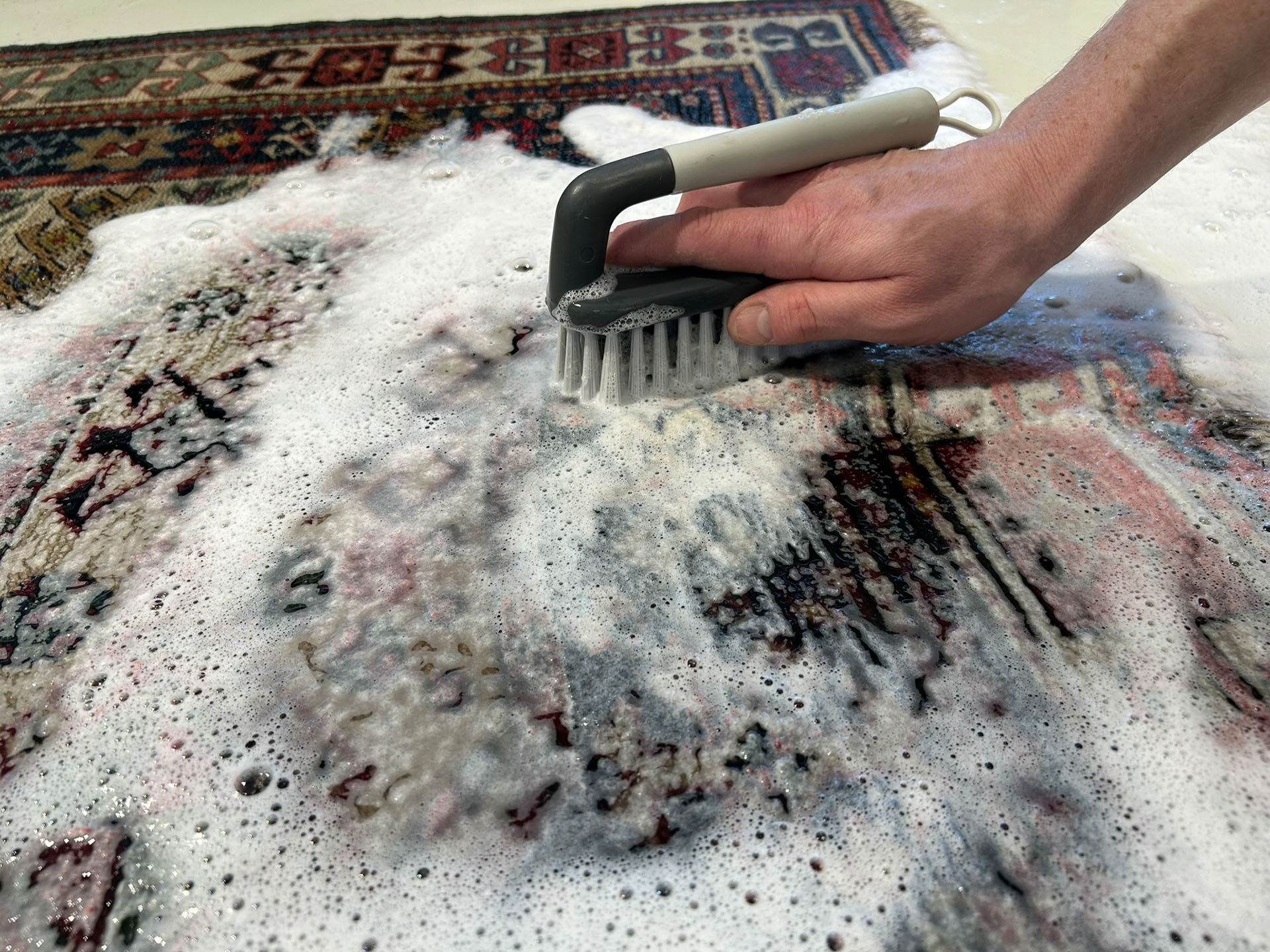 Im Wasserbecken mit chemiefreiem, ph-neutralem und biologisch abbaubarem Teppichwaschmittel wird der Teppich nun von uns per Hand bearbeitet. Dabei legen wir besonderes Augenmerk auf Flecken und hartnäckige Verschmutzungen.